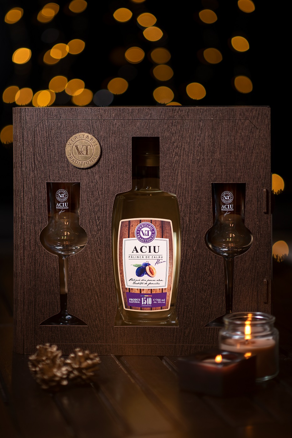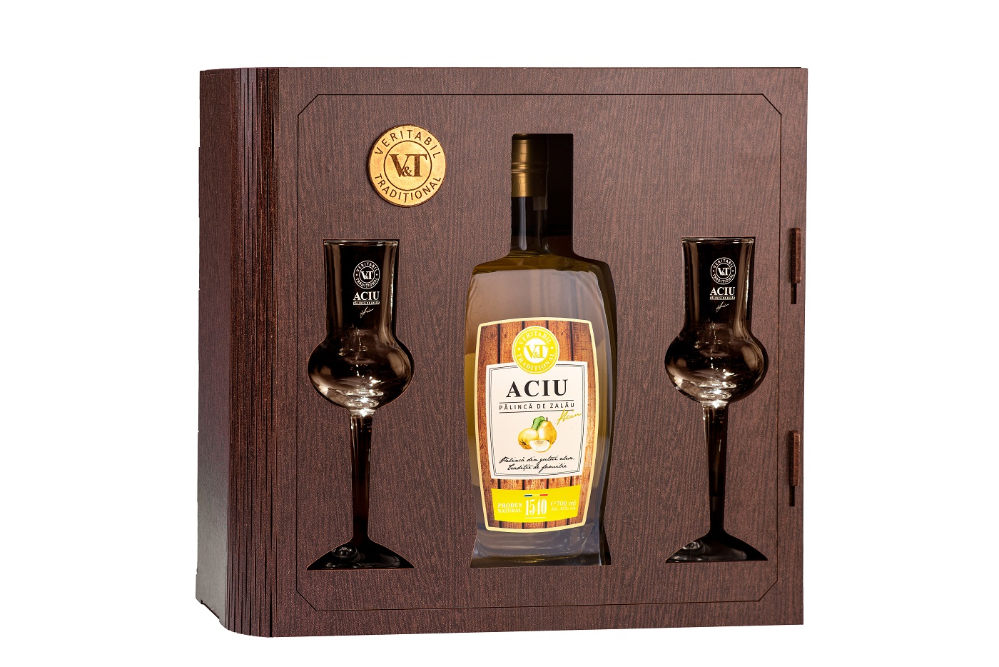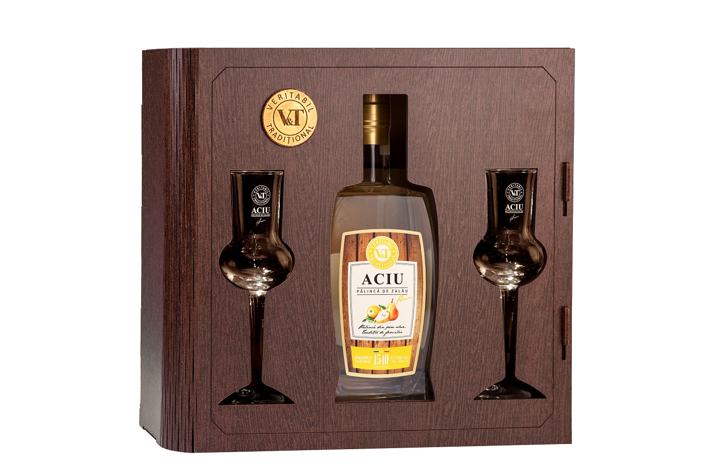 Set Palinca de Zalau Aciu cu 2 Pahare, format din cutie de lemn, 1 sticlă cu pălincă de 700 ml și 2 pahare gravate.